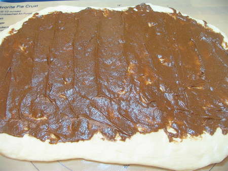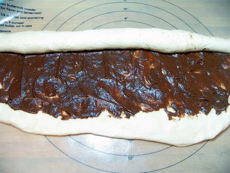 Roll the dough into a rectangle, and spread with the cinnamon filling, leaving one long edge uncovered.