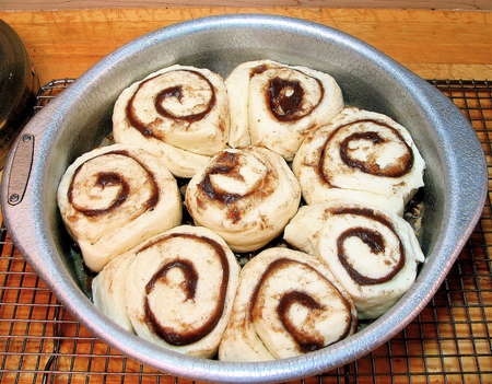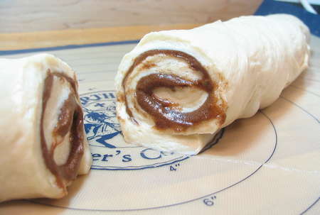 Cut the dough in slices. Gentle sawing with a serrated knife prevents squishing and keeps the filling where it belongs. If you're working on a silicone mat, watch out when you get to the bottom of the log; you don't want to cut the silicone. As I did here; note the saw mark on the silicone from an earlier (careless) bun-cutting episode.