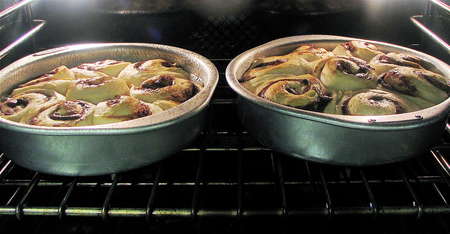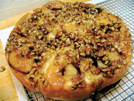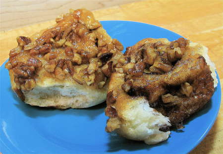 Sticky buns and cinnamon rolls—or sticky rolls and cinnamon buns—are all sisters under the skin. A basic cinnamon roll recipe (butter-rich dough rolled around cinnamon filling, sliced and baked) becomes a cinnamon roll with the addition of white icing. Or a sticky bun by baking the rolls in a simmering bath of sugar and butter laced with pecans or walnuts. Or a Persian Bun by flattening the rolls into ovals before baking, then icing with a white (or, traditionally, raspberry) glaze. Note: For all you Persian Bun fans out there, we’ll do a complete examination of this elusive sweet roll in a future blog.