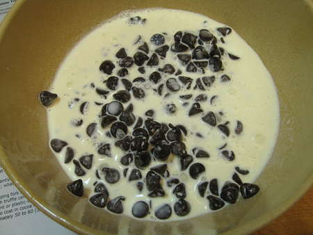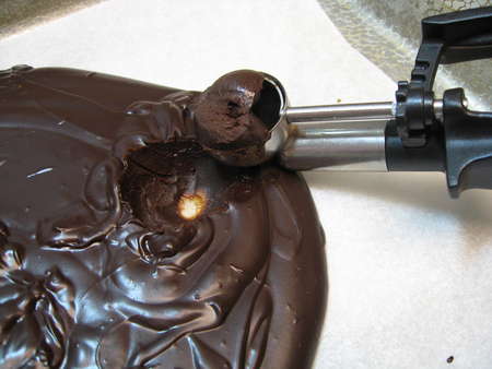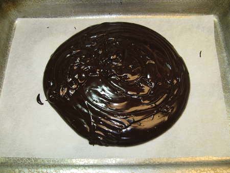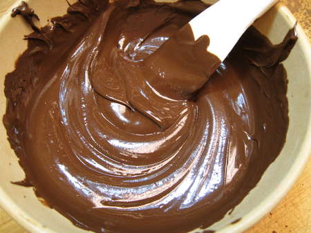 Pour the ganache into a parchment- or waxed paper-lined 9” x 13” pan. Don't spread it out; just let it sit there. Put the pan in the fridge for 60 to 90 minutes, till the chocolate is cold and “scoopable.”