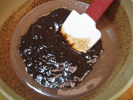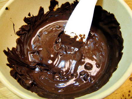 Stir till smooth again. Melting the chocolate in stages like this keeps it from becoming too hot and potentially scorching. This is also a technique for tempering chocolate, e.g., heating it gently to a certain point so that it remains shiny as it cools. That's not exactly what you're doing here, since tempering chocolate takes a candy thermometer, a fine hand, some knowledge of technique, and more time, but this is a handy shortcut.