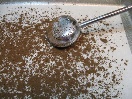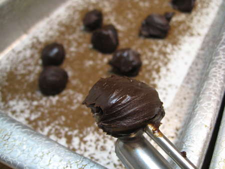 Meanwhile, sprinkle another parchment- or waxed paper-lined pan with cocoa powder. (We recommend our blend of Dutch and black cocoas, Double Dutch Dark Cocoa; its flavor is wonderfully smooth.) Use unsweetened baking cocoa if you want; but be aware the flavor of the truffles will be more biting, as unsweetened baking cocoa is higher in acid than Dutch-process. Make this layer of cocoa very thin; you're using it simply so the truffle centers don't stick to the parchment after scooping.
