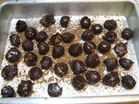 So now you have a panful of chocolate ganache balls. These are your truffle centers. Refrigerate for 30 to 60 minutes, so they're easier to handle. When they're chilled and stiff, first brush off any excess cocoa, then roll them between your palms to make nice, smooth balls. Yes, your palms will quickly become chocolate-covered. Wash your hands when they get too sticky to handle the ganache balls easily. As you roll, any of the cocoa from the parchment that's stuck to the centers will become incorporated.