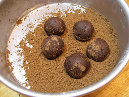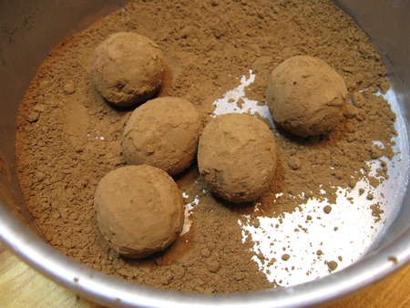 If you want the truffles' final coat to be a simple layer of cocoa (not melted chocolate), put cocoa in a shallow pan, drop in the truffle centers...