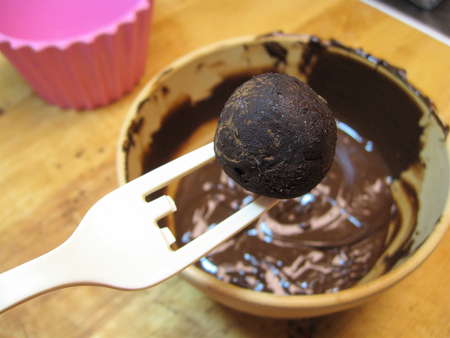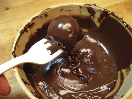 Next, you're going to dip the truffle centers in the melted chocolate. Remember, this is only if you haven't chosen to just simply coat them with cocoa.