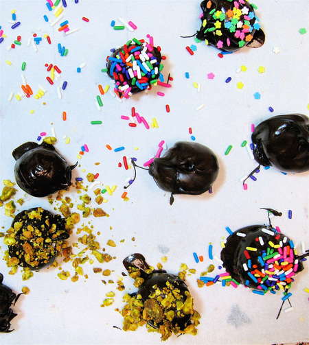 Immediately place the truffles on parchment or waxed paper, and sprinkle with the garnishes of your choice. I used chopped pistachios, nonpareils, sugar decorations, and cocoa nibs (not shown). Let them harden at room temperature, or in the fridge. This will take anywhere from 30 minutes to several hours.