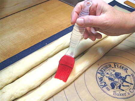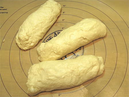Next, spray a work surface (here I'm using a silicone rolling mat) with vegetable oil spray. I use Everbake; it's a good all-purpose spray that, when you use it on your baking pans, doesn't leave that icky dark goo that some sprays leave. Divide the dough into three equal pieces, and gently pull them into rough logs. Walk away for 10 minutes; you can leave the dough uncovered. This gives the gluten in the dough a chance to relax, which will make it easier to roll into ropes.