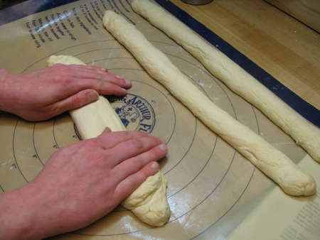 Keep going, trying not to stretch the dough too much. Stretching it could result in a misshapen braid, as the gluten will want to shrink back again as the braid rises.
