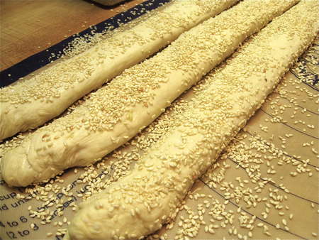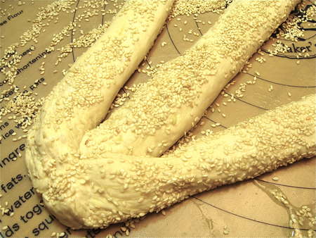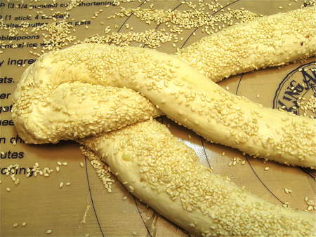 Paint each rope with 1 large egg white beaten with 1 tablespoon water. This “liquid glue” will make the sesame seeds adhere nicely.