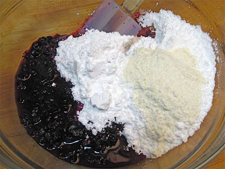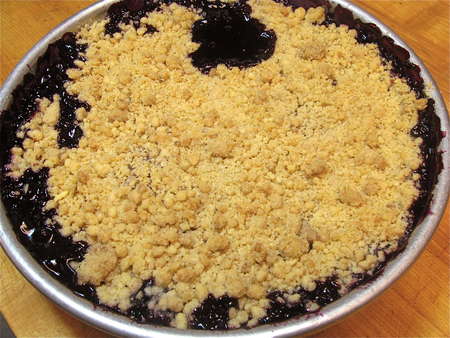 Mind you, my co-workers here at King Arthur Flour didn’t deem any of the “no-pass” versions a failure. Each and every one was eaten with gusto. Still… none was exactly what I wanted. And what, pray tell, was this lofty goal, the shining ideal of blueberry crispdom? Berry filling that was EXACTLY the right consistency: not stiff and rubbery, not a puddle of berry-filled juice, but soft enough to barely ooze when cut. The crisp had to be crisp, but not hard; and it had to stay heaped on top, not sink into the berries and become doughy.