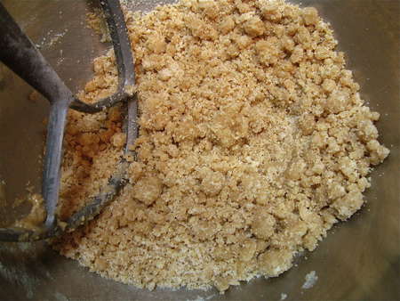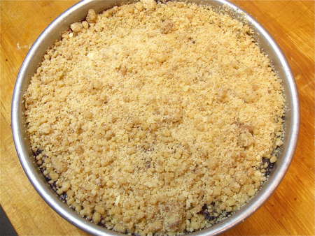 This is my favorite crumb/streusel topping. It differs from the norm in that you melt the butter before combining it with the flour, sugar, and cinnamon.