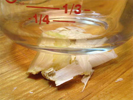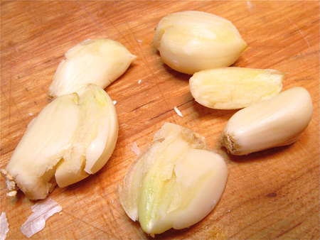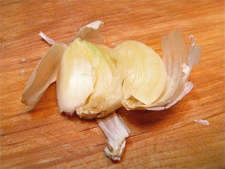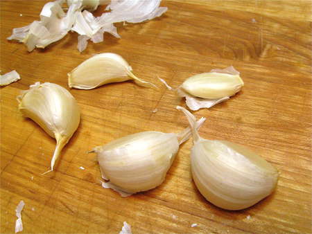 To peel the garlic easily, crush it with the flat side of a knife, the bottom of a measuring cup, or some other strong surface.