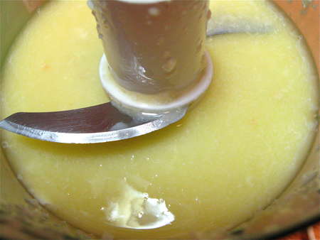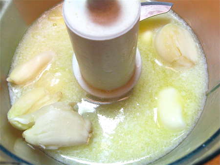 Next you need to chop the garlic. Easiest way: in a mini food processor, with the melted butter. Or with a garlic press or pair of scissors, if you don't have a mini processor.