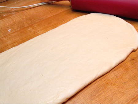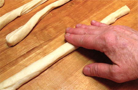 A few gentle back-and-forths under your cupped fingers is all it takes to round off the strips and lengthen them a bit, to about 11”. Lower-protein flour doesn't “fight back” like a higher-protein flour would.