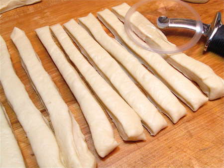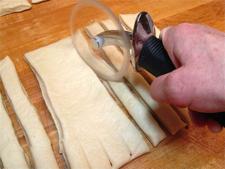 Use a knife, a bench knife, or a rolling pizza wheel to cut the dough into strips.