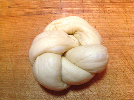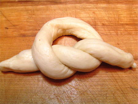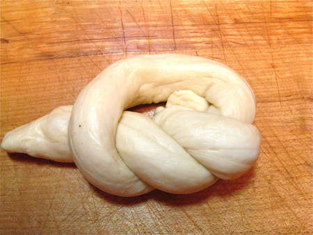 Next, tie each strip of dough into a knot. Watch closely now, sports fans..
