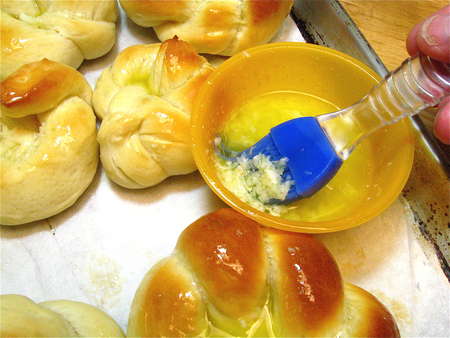 Brush with the garlic butter (which you've reheated briefly in the microwave, if it's solidified). Be sure to dredge the chopped garlic up from the bottom.
