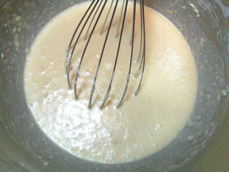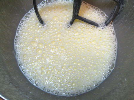 First, beat eggs, milk, and vanilla at high speed for 3 minutes. To me, that means splatters everywhere... thus the dish towel draped over the mixer bowl. I know, I know, a splatter guard came with this KitchenAid, but who knows where it is? Not I.