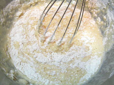 Add the butter or oil, then the flour, baking powder, salt, and sugar.
