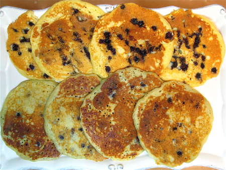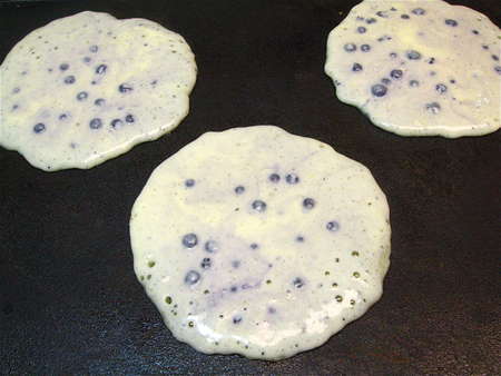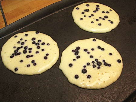 ...that yield a greenish-blue pancake (bottom row). See how much nicer the pancakes look when you scatter the frozen berries on top as they cook? That's my test-kitchen tip for today.