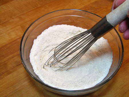 I had this theory that it might be easy to put together scone dough in a gallon-size zip-top freezer bag. So I put the dry ingredients, plus cheese, chives, and bacon, into the bag.