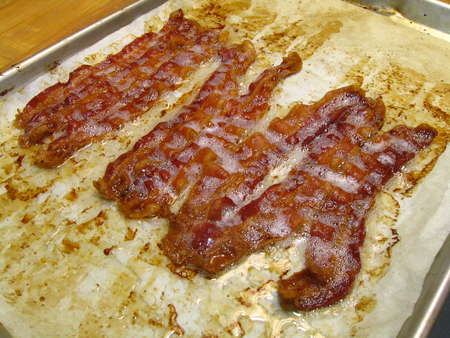 Next, the bacon. When you don't feel like standing over a grease-sputtering frying pan, lay the strips on a parchment-lined baking sheet, and bake them instead.
