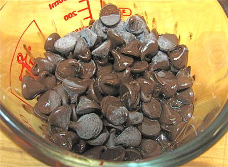 Combine chocolate chips with a bit of vegetable oil and heat in the microwave till the chips are very soft.