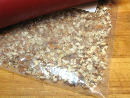 First, crush some nuts. Here I'm using a zip-top bag and rolling pin. Walnuts or pecans (as I use here) are both good choices, as are almonds. Hazelnuts would be fine, too. Peanuts? Well, kind of plebeian, but if you like the chocolate-peanut combo, go for it.