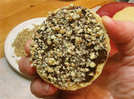 But something still wasn’t right. I could see the chocolate looking sparse, or not setting up right, or… How about coating with chocolate, then dipping in crushed nuts? Yes, that’s it. The nuts would fancy things up, plus help keep any soft chocolate from messing up the surrounding cookies.