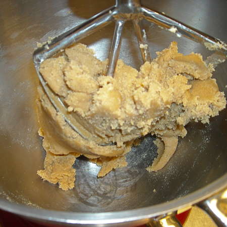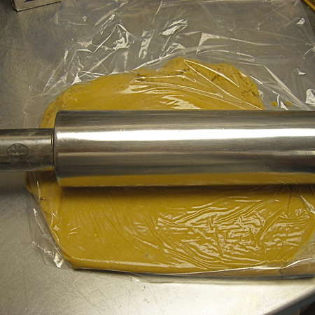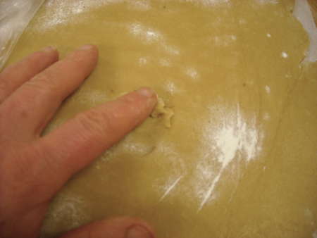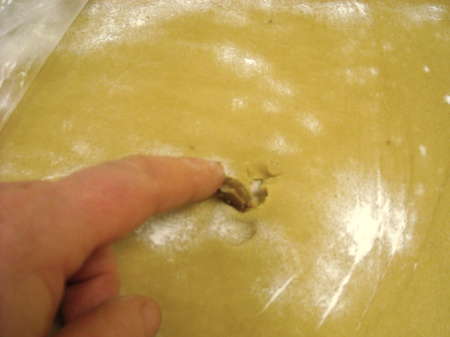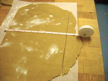 Once the dough is chilled enough to roll out, take half of it and place it on a piece of parchment or waxed paper, lightly dusted with flour. When I started rolling the first part of the dough, I found an island of unincorporated brown sugar staring back at me. Time for some quick cosmetic surgery.