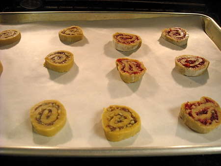 Repeat with the remaining dough and filling. Chill the logs for several hours or overnight; you can also freeze the rolls at this point if you’re trying to get ahead. Once the dough is firm enough to slice, take it out of the refrigerator and let it temper for 10 minutes so it doesn’t crack when you slice it. Cut into 1/3-inch slices,