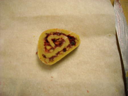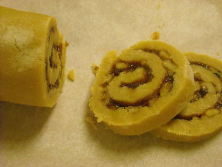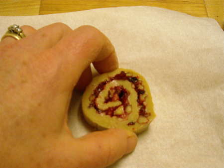 Here’s a hint for cutting: to keep the cookies round, give the roll of dough a quarter turn after each slice. That way the pressure of the knife won’t press the cookie down each time. If the dough gets too soft or you forget to turn the roll, you may end up with a slice that looks like this: