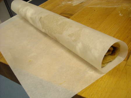 If the dough sticks to the paper, tease it off with a floured hand or scraper. After the roll is formed, use the paper to wrap it (this will help support the dough, which is soft).