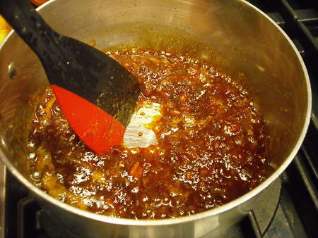 Bring to a boil over medium-high heat, stirring until the sugar dissolves. Reduce the heat and simmer for 15 minutes, stirring occasionally, until the mixture thickens and makes popping sounds as it boils. You should be able to see the bottom of the pot for 5 seconds when you move your stirring weapon across it.