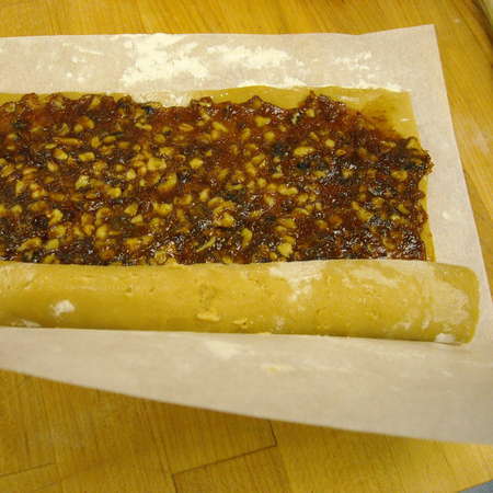 Spread half the filling over the dough, covering the entire surface. Use the parchment to help you roll the dough up lengthwise.