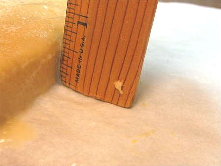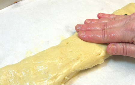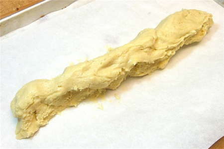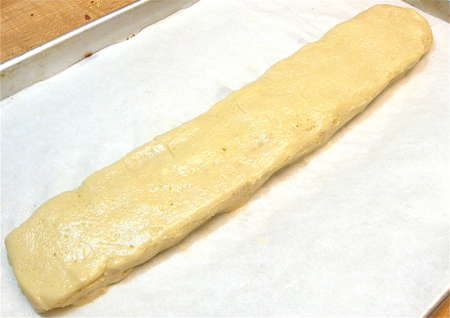 Wet your fingers (to cut down on the stickiness), and smooth the biscotti into a 14” x 2 1/2” x 3/4”-tall rectangle.