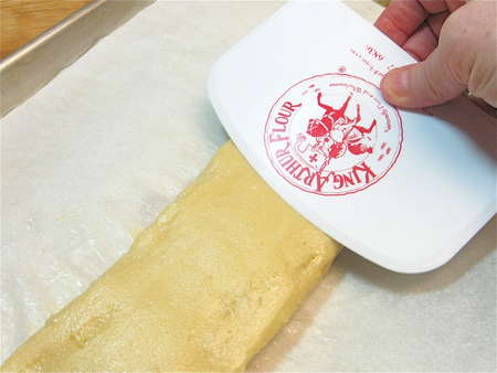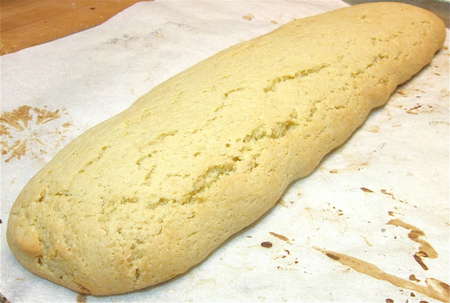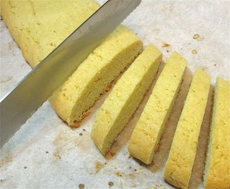 Slice the dough about 3/4” thick. If you cut crosswise, you'll have more, shorter biscotti. Cut on a diagonal for fewer, longer biscotti. The more pronounced the diagonal, the longer the biscotti (and the fewer you'll get from the recipe).
