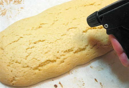 Remove it from the oven, and allow it to cool on the pan anywhere from 10 to 25 minutes, according to whatever else you're busy doing. Then, when you're ready to cut the biscotti, spritz the dough lightly with water. This helps cut down on crumbling as you slice.
