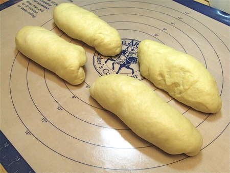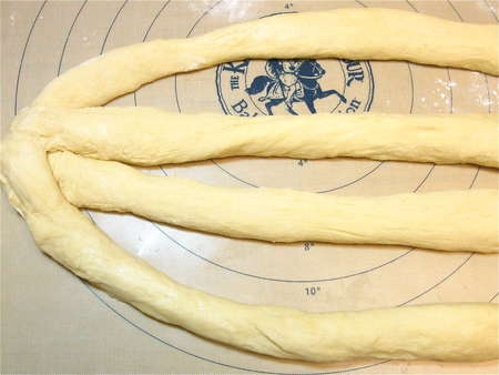 Remove the dough from the bread machine. We're going to make a four-strand braid here, so divide dough into four pieces, shaping each into a rough log on a lightly greased silicone mat (or other clean surface). If you want to make a simple three-strand braid, divide the dough into three pieces.