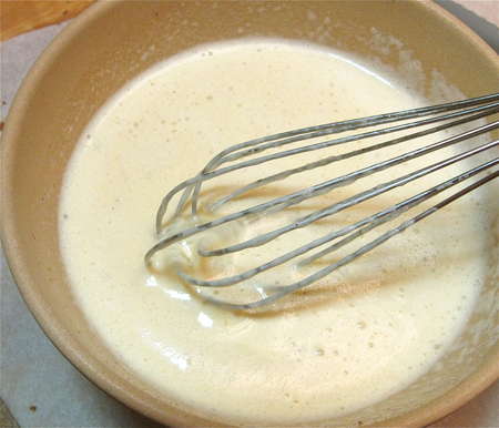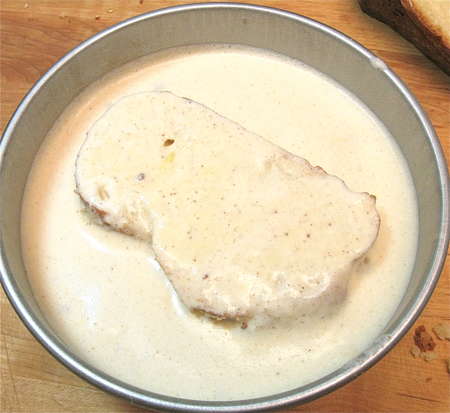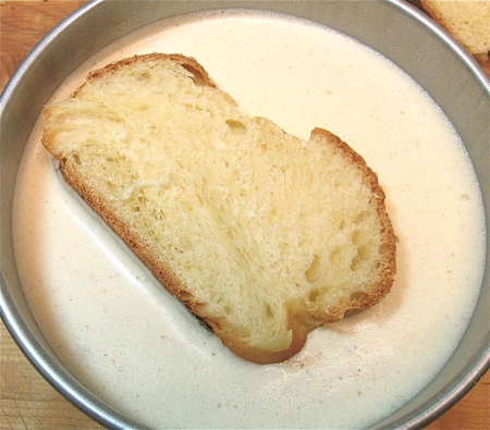 Pour the liquid into a shallow pan, and set a slice or two of challah in the pan to soak for about 30 seconds or so. The drier/staler the challah, the longer you should let it soak. It shouldn't be sodden, but the liquid should definitely penetrate into the interior somewhat.