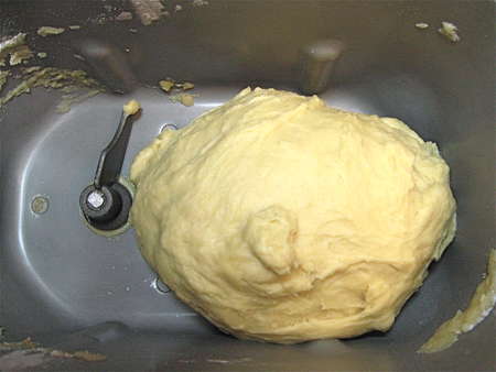 First, combine all of the ingredients—water, oil, honey, eggs, flour, salt, and yeast—in the pan of your bread machine. Program for the dough cycle, and press start. This is what the dough will look like (above) after 5 minutes or so. If it appears too dry or too wet, adjust with some extra water or flour.