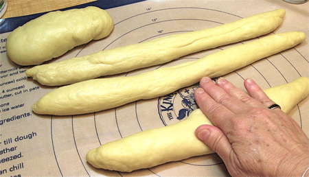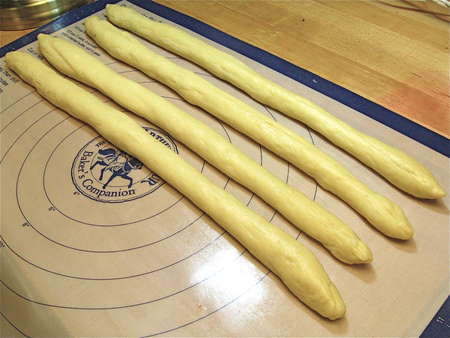 Gently roll each log until it's at least 18” to 24” long; the longer the logs, the longer/skinnier the loaf.