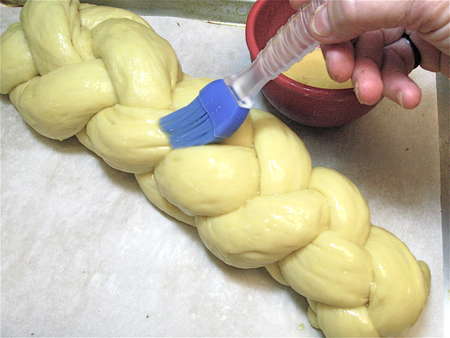 Let the loaf rise till it's puffy, then brush with an egg-and-water glaze.