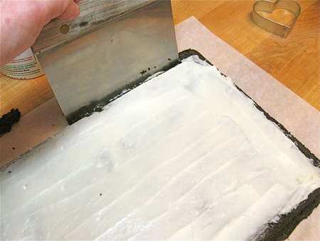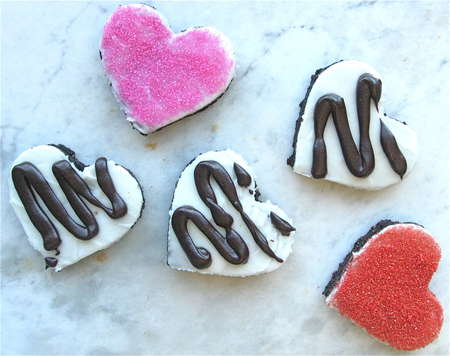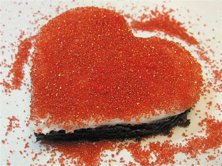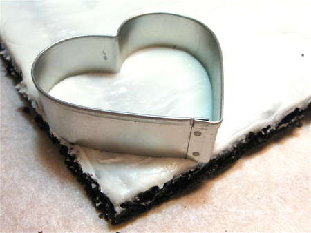 Use a heart cutter (or the cutter of your choice) to cut hearts. Yes, there'll be scraps left over. YUM.
