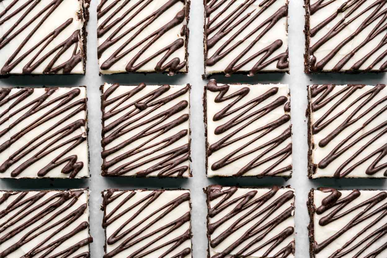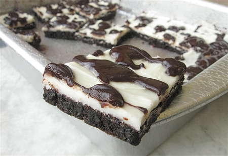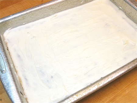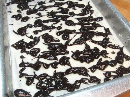 Dollop the drizzle over the glazed brownies. The drizzle really isn't thin enough to drizzle; but “chocolate drizzle” sounds better than “chocolate dollop,” wouldn't you say? Recipe-writing 101.