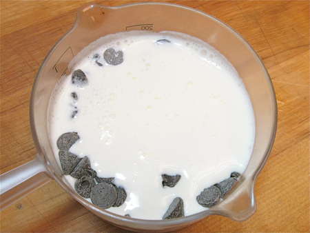 To make the chocolate drizzle, combine chocolate chips and heavy or whipping cream in a microwave-safe cup or bowl. Heat till the cream shows small bubbles around the edge.