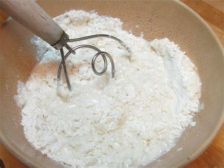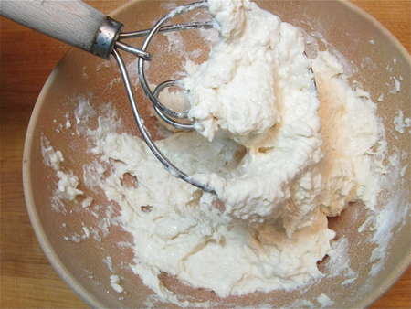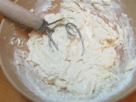 Mix. A dough whisk is a great tool here; the gloppy dough doesn’t get stuck in the wires.