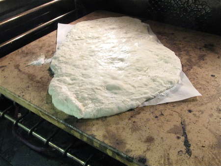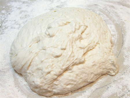 Lahey’s recipe called for a rest of up to 24 hours. I tried that, and found the dough to be too assertive, too “sour,” at least for my taste. It fought with the pizza toppings. Lahey calls for 12 hours minimum, so I let mine rest for 16 hours. It looked like this. Dough? NO WAY.