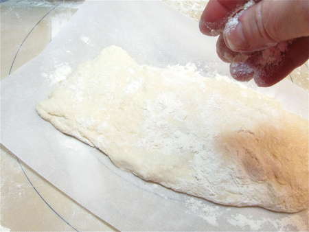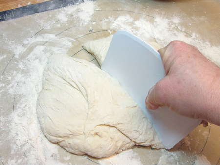 “Lightly sprinkle the top with flour.” I threw a handful of flour atop the dough. “Fold the dough over on itself once or twice.” I took a dough scraper and folded the mess over, and suddenly, it began to look like dough. Hey, maybe this is going to work after all…