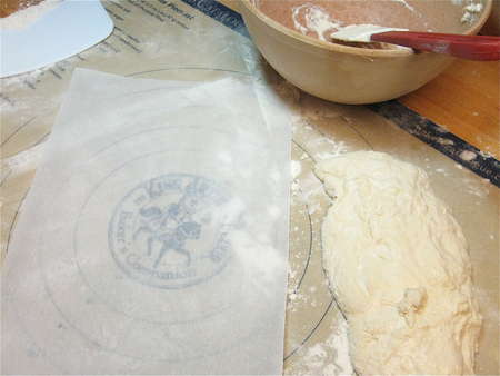 Lahey’s directions said to “place the dough on a lightly floured work surface.” Well I tell you, there was no “placing” this dough anywhere. I heavily floured my silicone rolling mat, and poured the “dough” onto it.